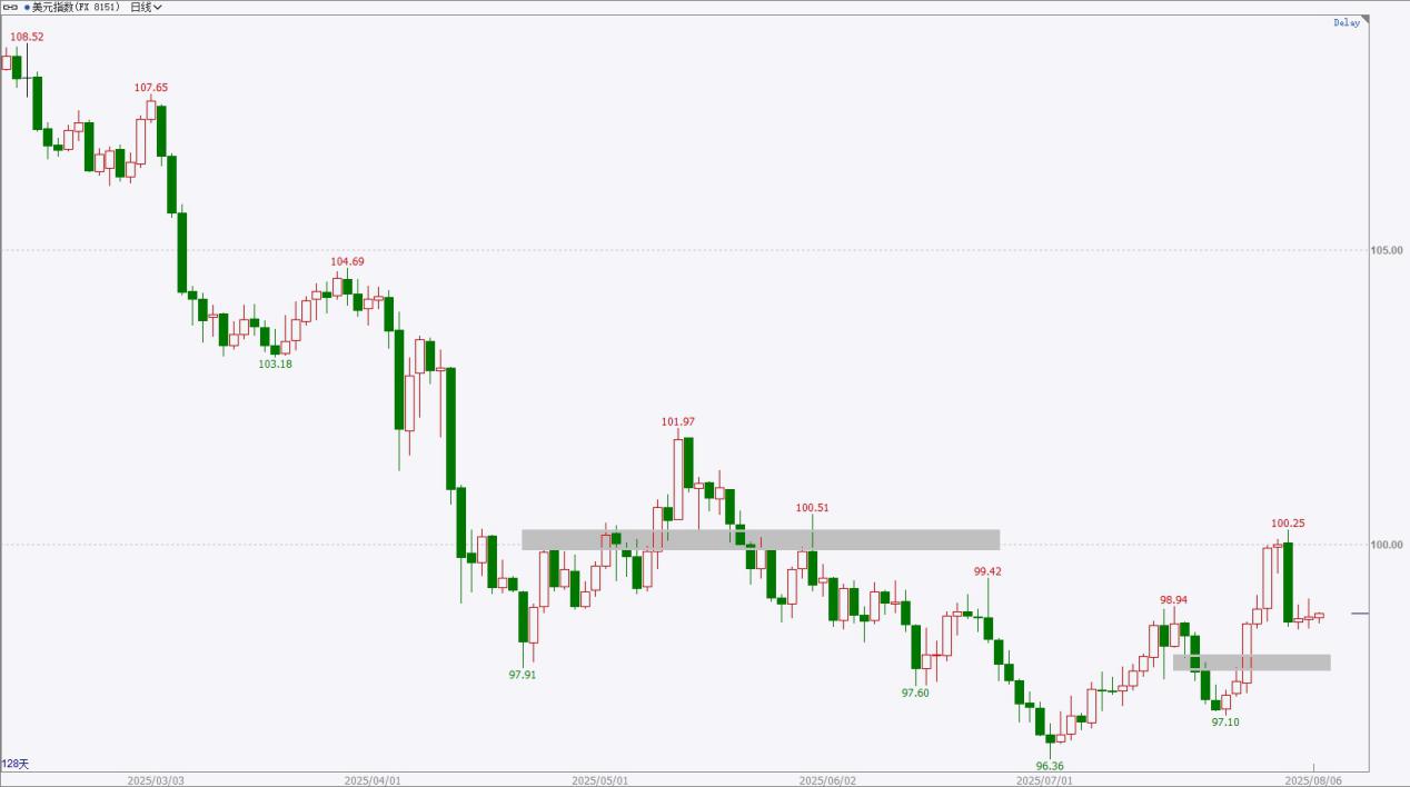 7月底美聯儲會議,連續第五次按兵不動,票委出現分歧,通脹水平略高,勞動力市場平衡狀態,可能存在下行風險,上半年經濟增長放緩,前景存在不確定性,對關稅影響的評估變化不大。7月非農,新增就業人數7.3萬人,不及預期,失業率小幅升至4.2%,符合預期,勞動力市場放緩跡象。6月CPI年率小幅升溫;6月核心PCE物價指數和前值持平;7月ISM製造PMI值小幅回落。