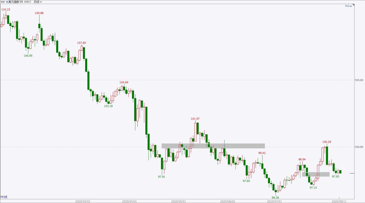 미국 달러 지수는 지난주 약간 조정되었으며, 소폭 하락하여 단기적인 진동 추세를 보이고 있으며, 안정화의 징후는 없습니다. 단기적으로는 저수준의 진동을 경험할 수 있으며, 지지 영역의 유효성에 주목해야 합니다. 구조를 깨면 추세가 약해질 수 있습니다. 전반적으로 가격은 저수준의 진동 상태에 있으며, 지지 영역을 여러 번 테스트하고 있으며, 안정화 신호를 주의 깊게 살펴봐야 합니다. 상단 저항 영역은 약 100-100.5이며, 하단 지지 영역은 약 97.5-98입니다.
